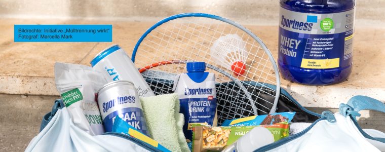 So umfangreich wie das Angebot an Nahrungsmitteln für den Sport ist, so vielfältig sind auch ihre Verpackungen: von Folienverpackungen für Energieriegel über Dosen aus Kunststoff oder Verbundmaterial für Eiweißpulver bin hin zu sogenannten „Quetschies“ mit Fruchtpüree. Diese und vergleichbare Verpackungen gehören in den Gelben Sack.