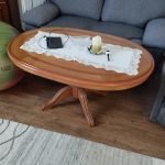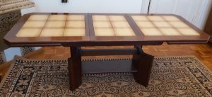 Gut gepflegter massiver Holztisch mit Fliesen.