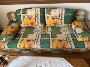 Die Couch ist ausziehbar mit Bettkasten, 2 Armlehnkissen und bunt bezogen.