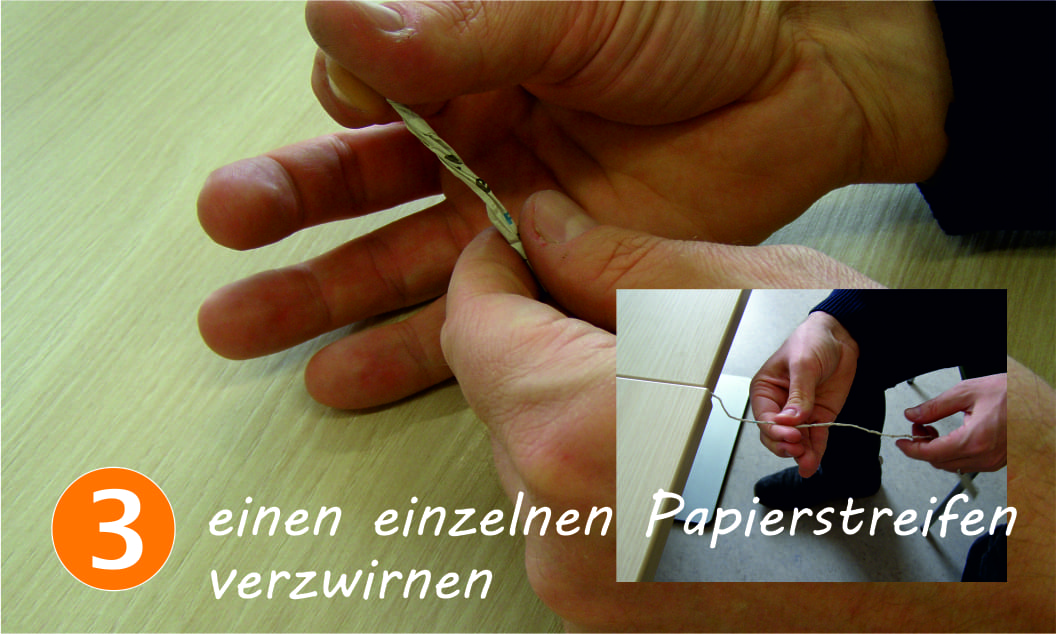 Wenn es dir gefällt, kannst du auch die einzelnen bereits verdrehten Papierfäden miteinander verknoten.