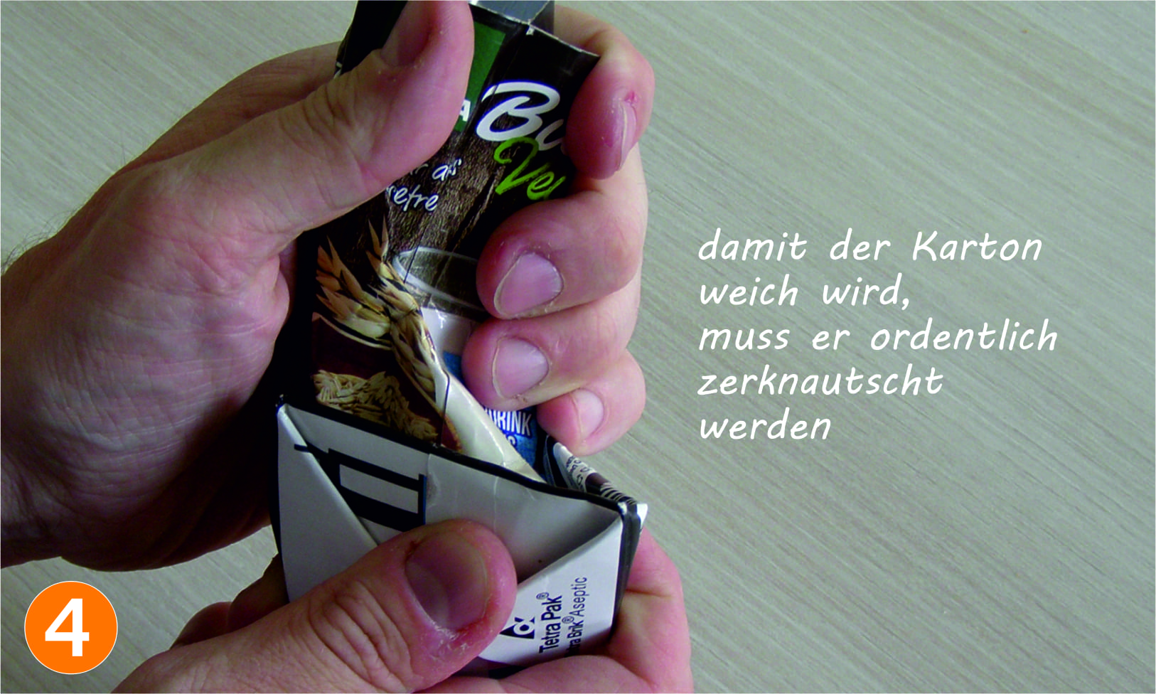 Schritt 4: Damit sich die äußere Beschichtung späer gut ablöst, quetsche und drücke den Karton zusammen, damit er weich wird. Wenn dir das schwerfällt, frage deine Eltern, ob sie dir dabei helfen können.